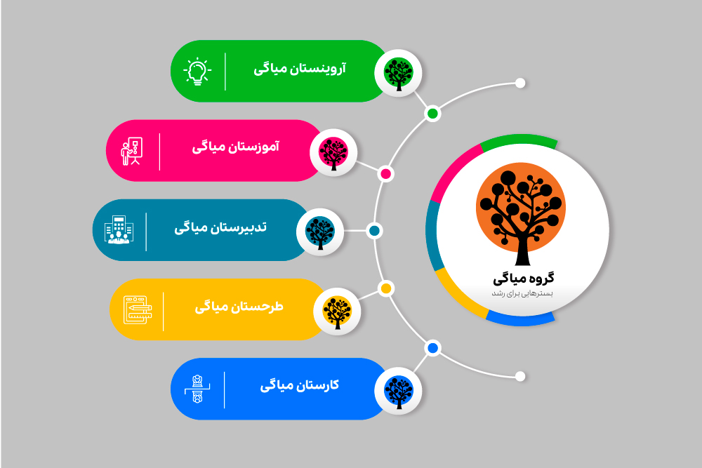 گروه میاگی 5 شاخهی کاری متفاوت دارد و برای اهالی حرفهای رشتههای مختلف و کار و کسبهای نوپا، کوچک و متوسط؛ در قالب یک پلتفرم یکپارچهی رشد کار میکند تا در آن امکانهایی برای رشد داشته باشند و آیندهای معنادار و پایدار برای خودشان خلق کنند. هر یک از پلتفرمهای زیر مجموعهی گروه میاگی یک واحد کار و کسب مستقل است که در عین ارائهی محصولات و خدمات اختصاصی خود، برای چالشهای حرفهای رشد و توسعهی افراد و کار و کسبها؛ ظرفیت و توان همافزایی با دیگر پلتفرمهای مجموعه را هم در خود دارد. این امکان در قالب راهکارهای یکپارچه و همسویی که در بستر منعطف و پویای گروه شکل پیدا میکنند؛ فراهم میآید تا با تمرکز بر سه رکن: تحلیل راهبردی، برنامهریزی راهبردی و برنامهریزی اجرایی، ظرفیتهای رشد نهفته در افراد و سازمان را بالنده کنند.